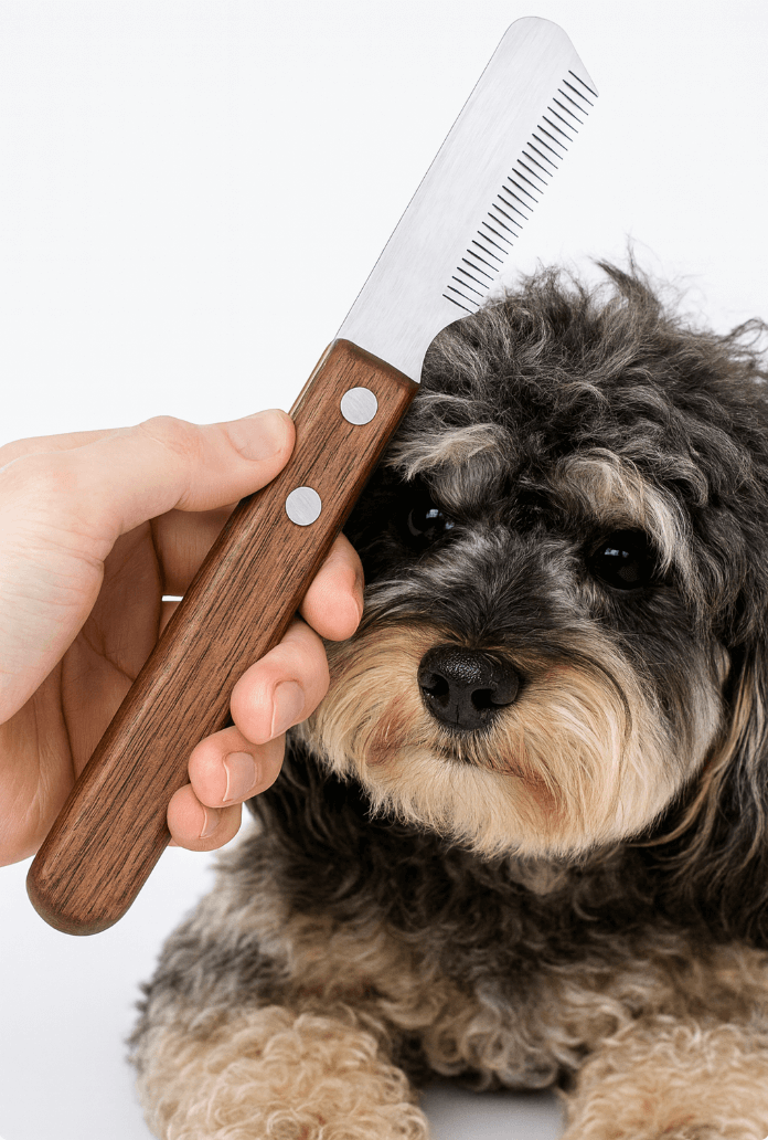 Ein Trimmmesser ist ein spezialisiertes Pflegewerkzeug, das auf den ersten Blick wie ein kleines Messer mit gezahnter Klinge aussieht. Anders als der Name vermuten lässt, schneidet es aber nicht. Stattdessen dient es dazu, abgestorbene Haare aus dem Fell zu zupfen.